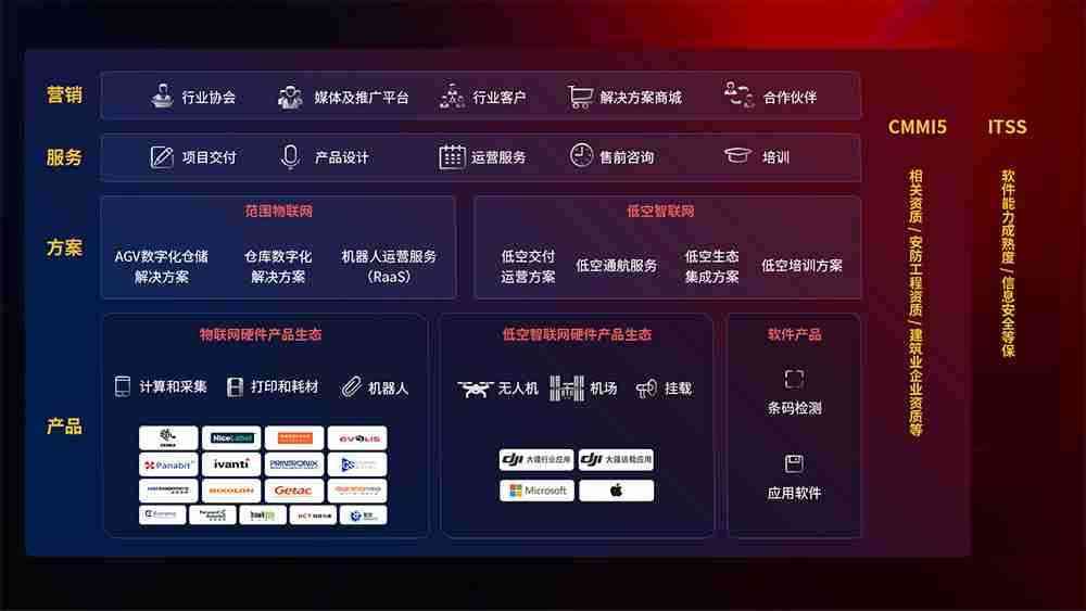 聚合国内外先进的物联网硬件产品品牌,,,,聚焦数字化仓储、、机器人运营、、、、低空智联网等领域,,,,共同打造适合客户业务场景的解决方案并提供交付服务